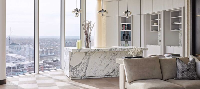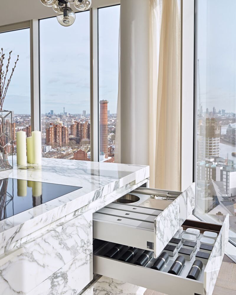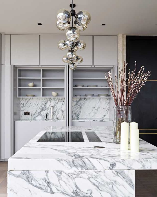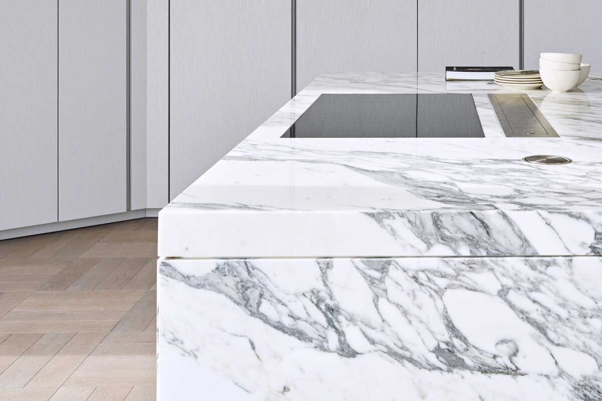 Door de kubusvorm van het eiland lijkt het marmer op een blok steen dat net uit de steengroeve is gesneden. De plank en het werkblad zijn gemaakt van hetzelfde materiaal, wat te zien is als de pocketdeuren van de hoge kast open zijn.