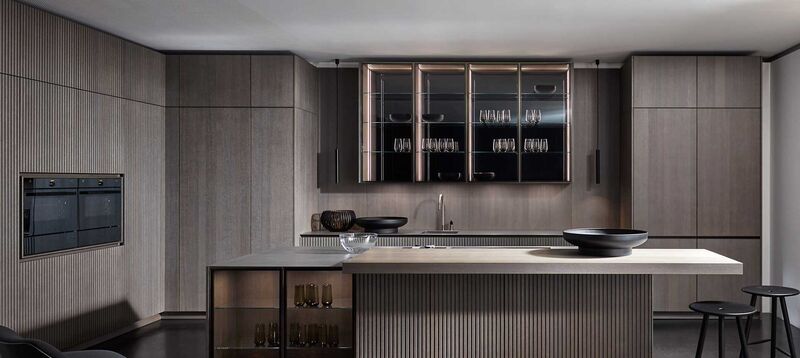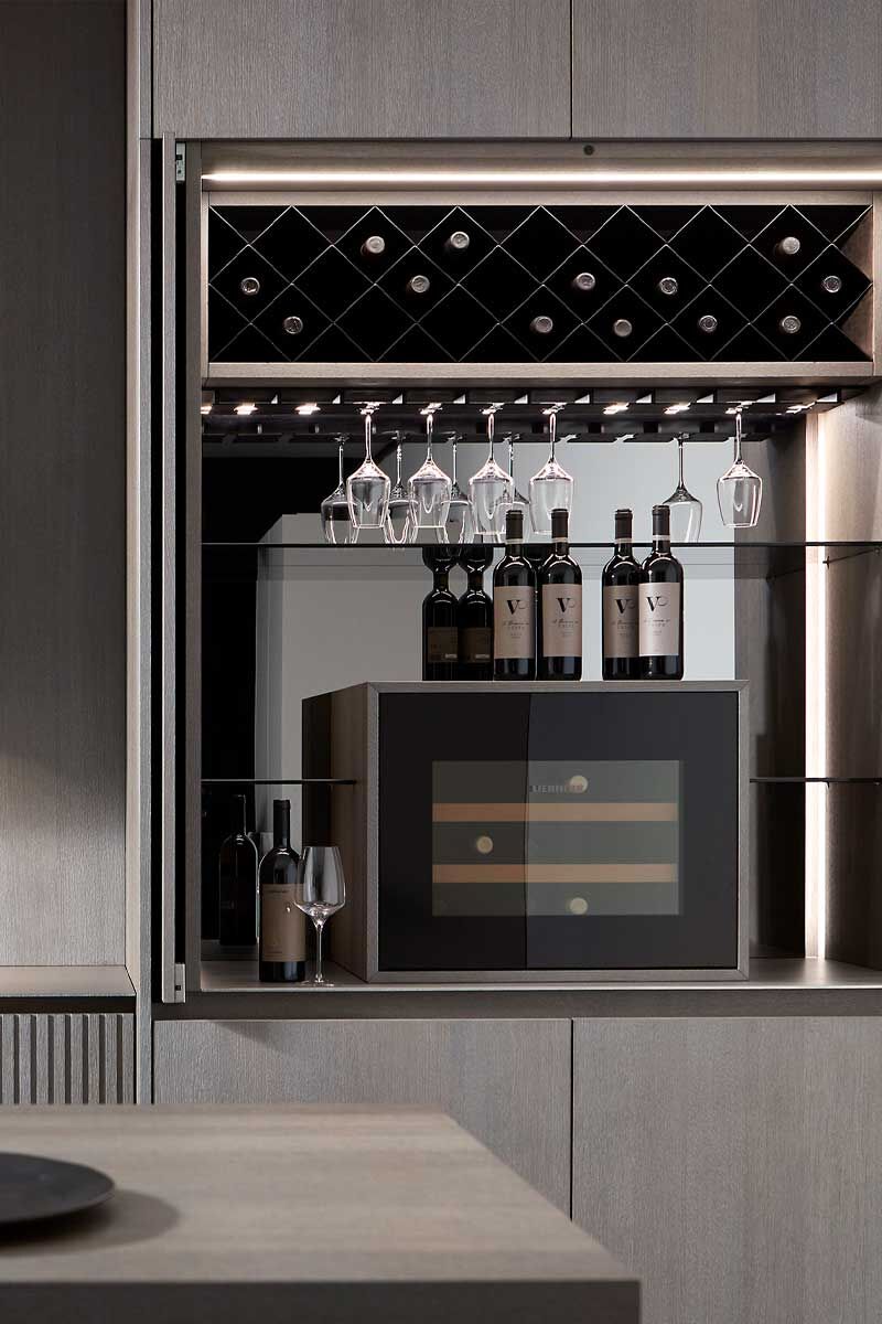 De glazen deuren van het eiland vinden we terug in de bovenste kasten waar ze in hangen met een onzichtbare scharniertechniek. Het bargedeelte daarachter is intern verlicht en krijgt door de gespiegelde achterwand extra optische diepte.