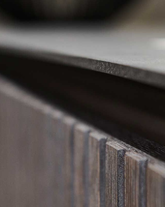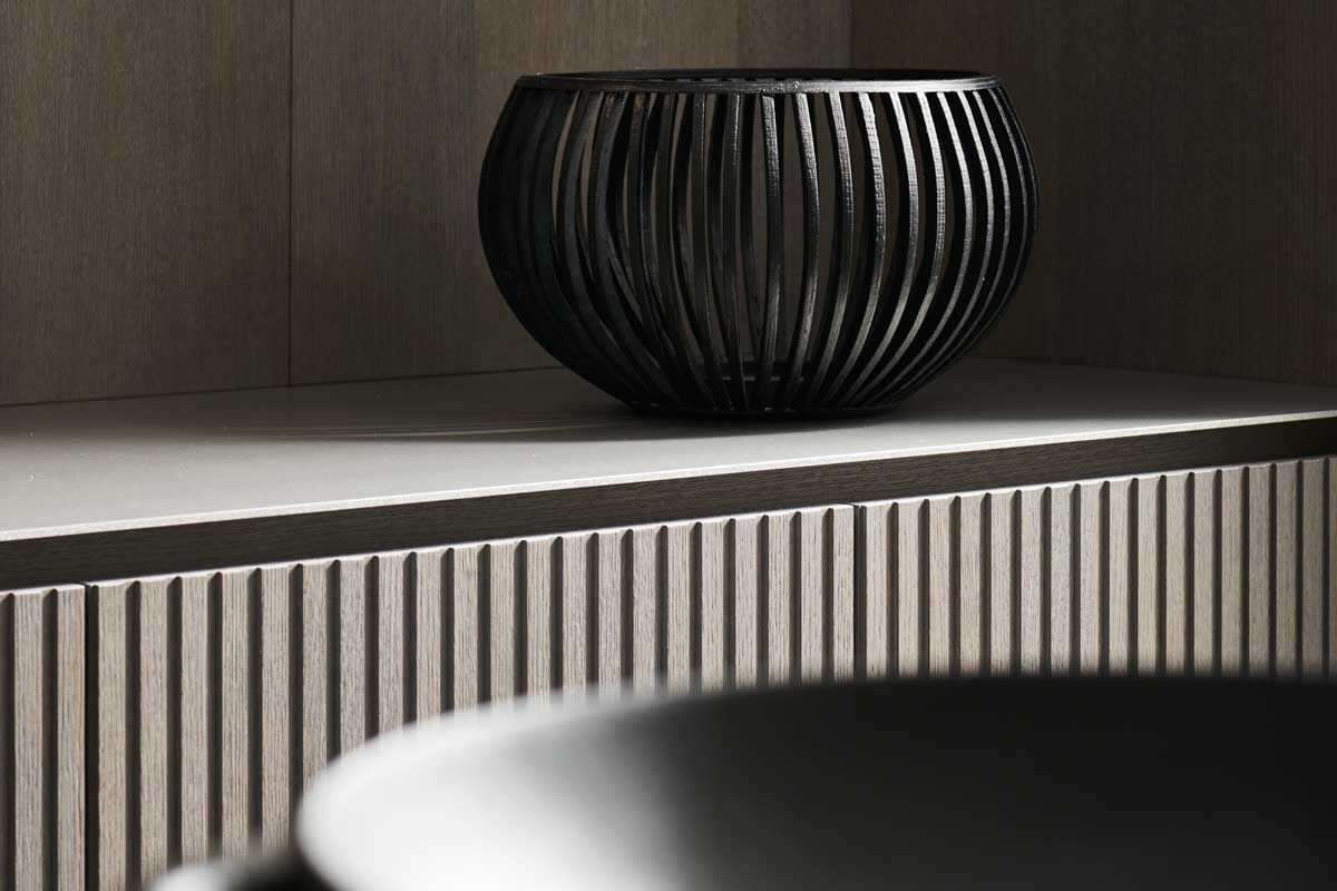 De zilvereik wordt hier gebruikt in pure vorm en in lamellenstructuur. Dit zorgt voor een aantrekkelijk spel van schaduw en kleuren. De algehele look is klassiek en ingetogen.  De lamellen zijn vakkundig en nauwkeurig op maat gemaakt.