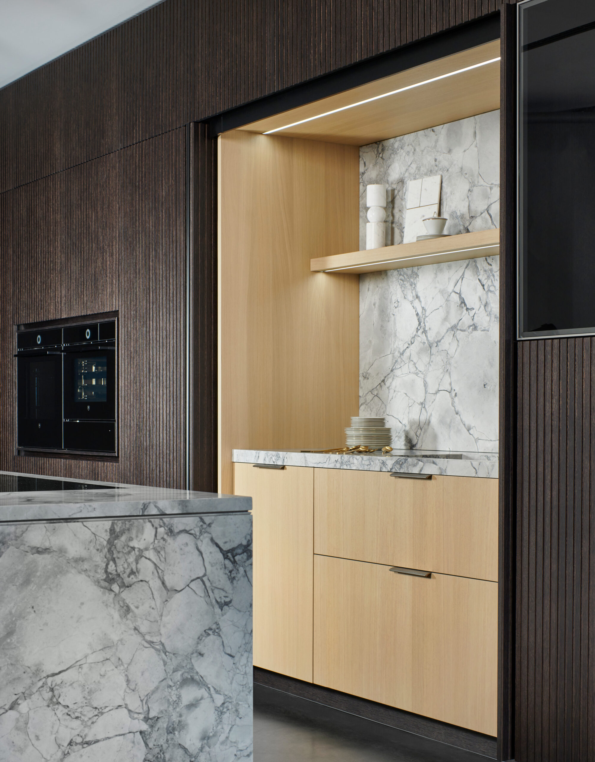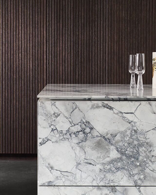 Natuursteen zet sterke accenten en definieert de dialoog met de omringende materialen. Kwartsiet Bianco Nuvola kenmerkt het puristische eiland met zijn tijdloze heldere esthetiek, die perfect tot uitdrukking komt voor de hoge kasten in eikenfineer.