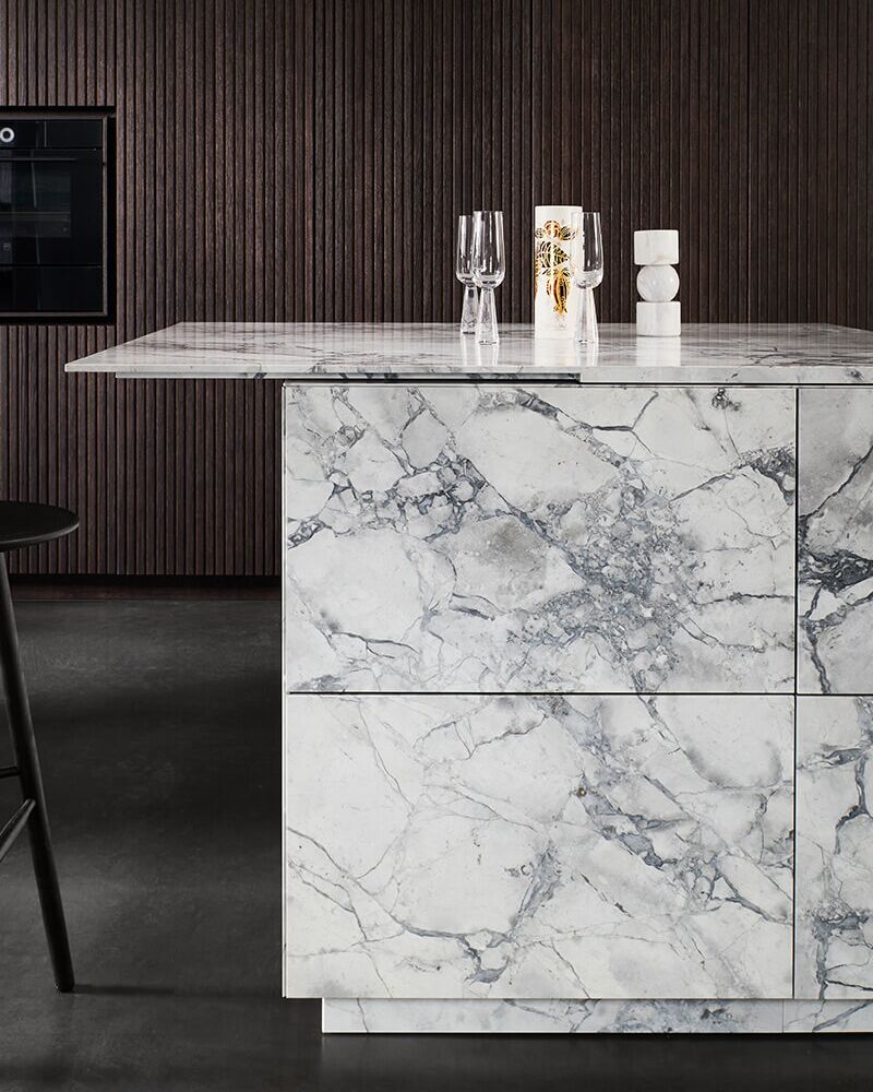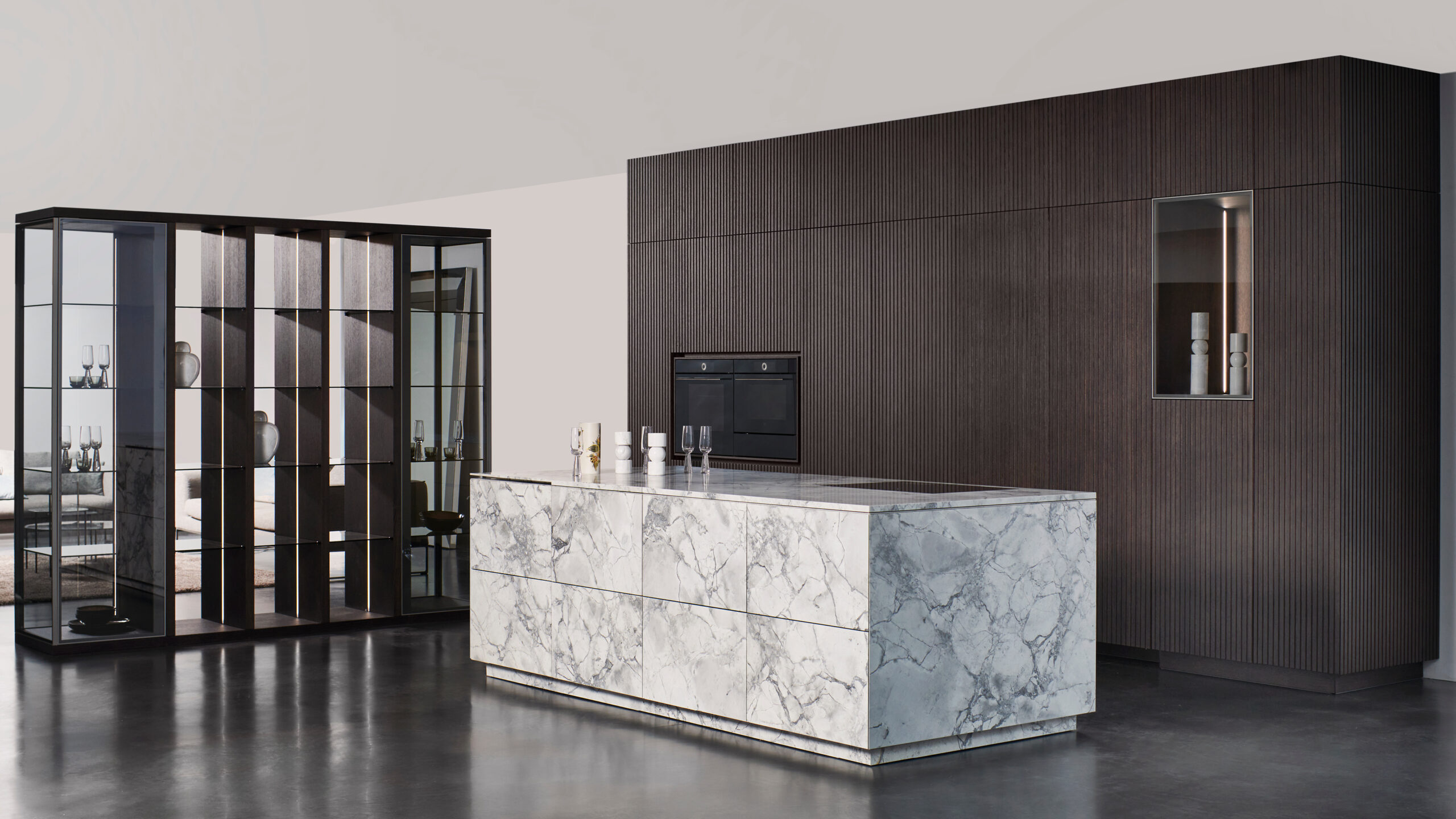 Heldere lijnen en elegante oplossingen vormen samen met de speciale eggersmann details een puristische keukenarchitectuur die de schoonheid van de natuursteen perfect benadrukt. Het werkgedeelte kan worden verborgen achter innovatieve, inklapbare schuifdeuren.
