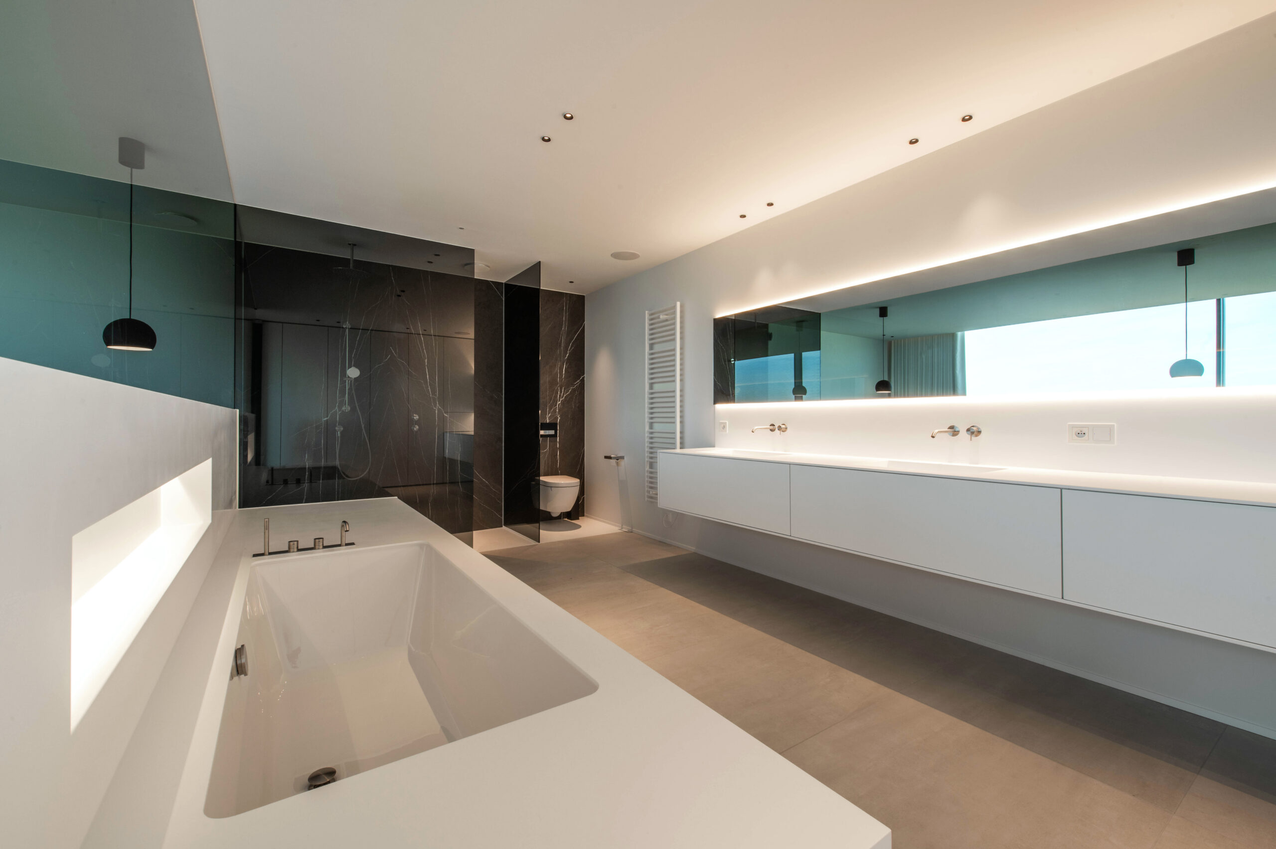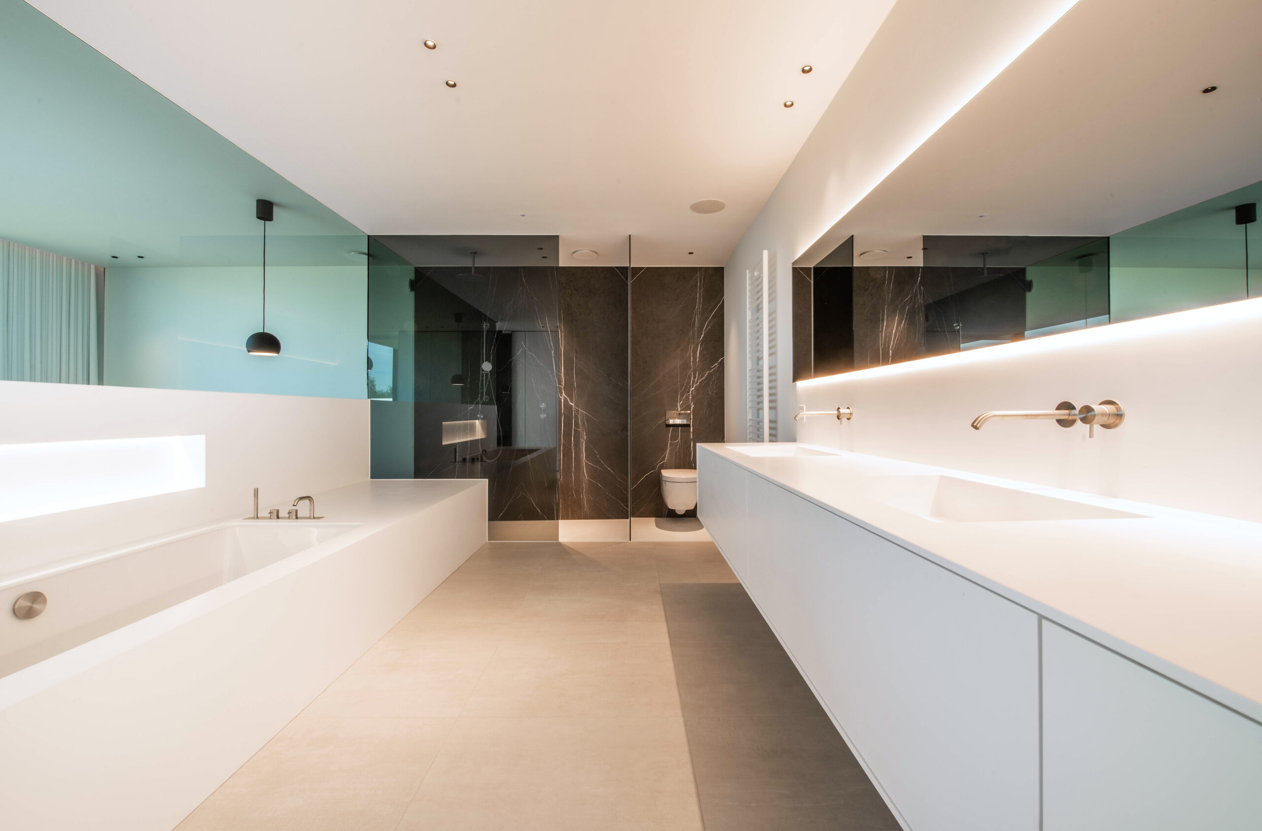 Openheid, zachte overgangen en een harmonieus lijnenspel bepalen de sfeer, zowel in de keuken als de badkamer.